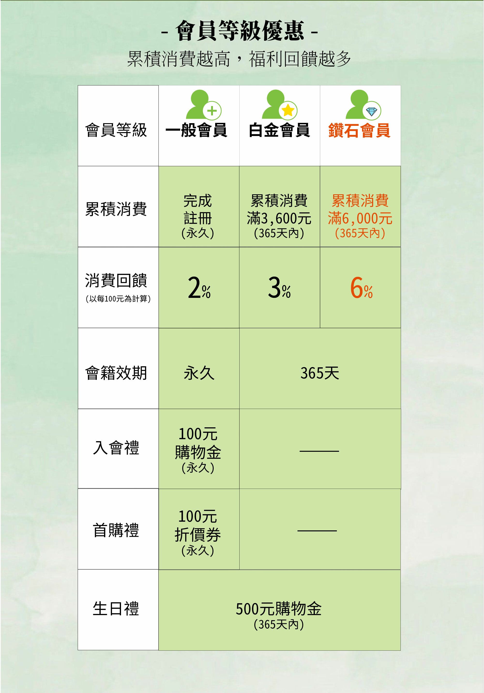 註冊會員即可享有會員的折扣優惠,以及累積消費買的越多累積越快,生日當月再贈送生日購物金!會員等級越高福利越多!