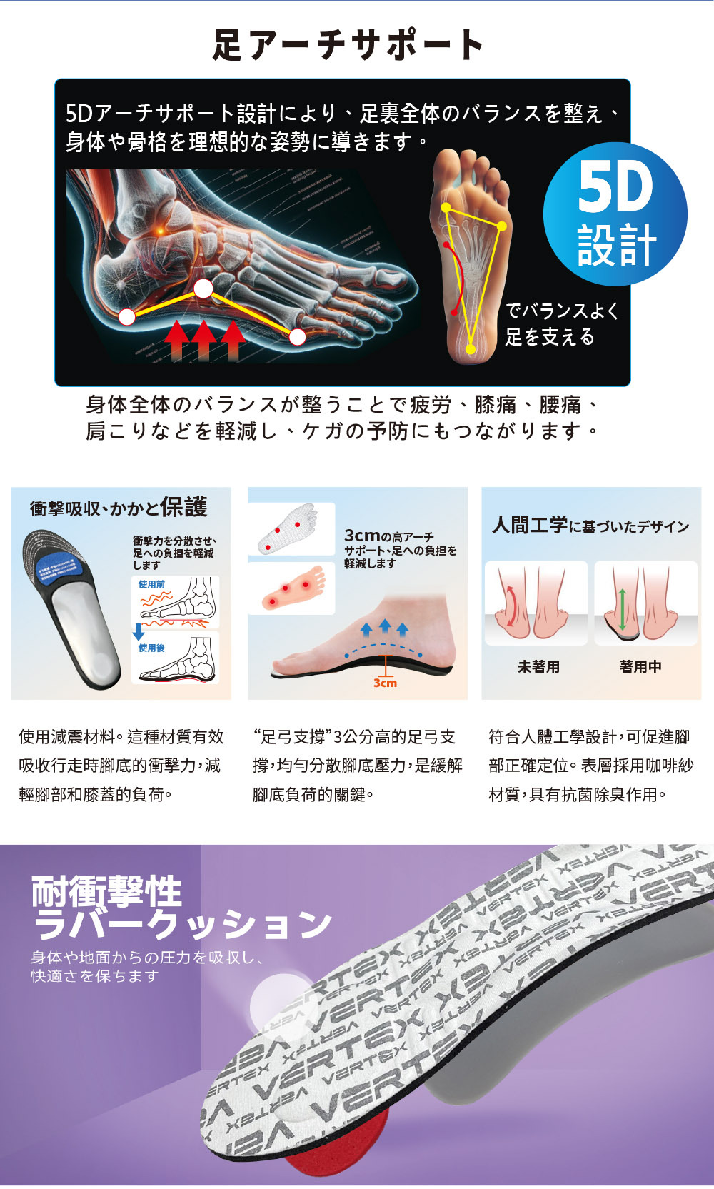 多區段力學結構設計,每一步都能均勻分散全腳底壓力,智慧回饋調節功能,讓長時間站立亦能維持最佳支撐及舒壓效果,徹底減輕足部及身體負擔。