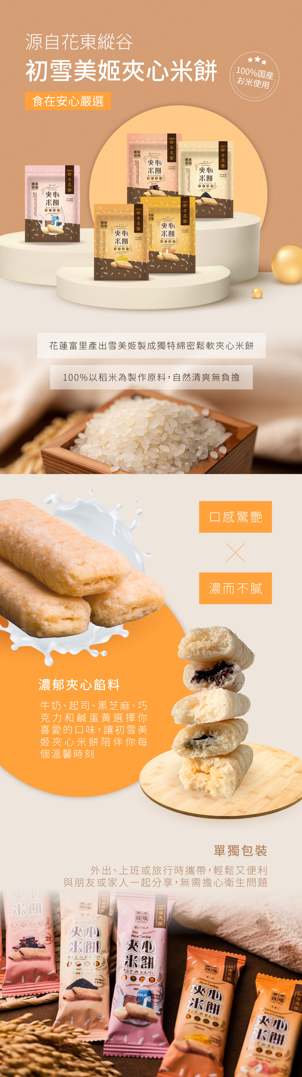 採用【花蓮富里初雪美姬米】,打造綿密鬆軟的夾心米餅,外層香酥、內餡濃郁,每一口都充滿幸福滋味!