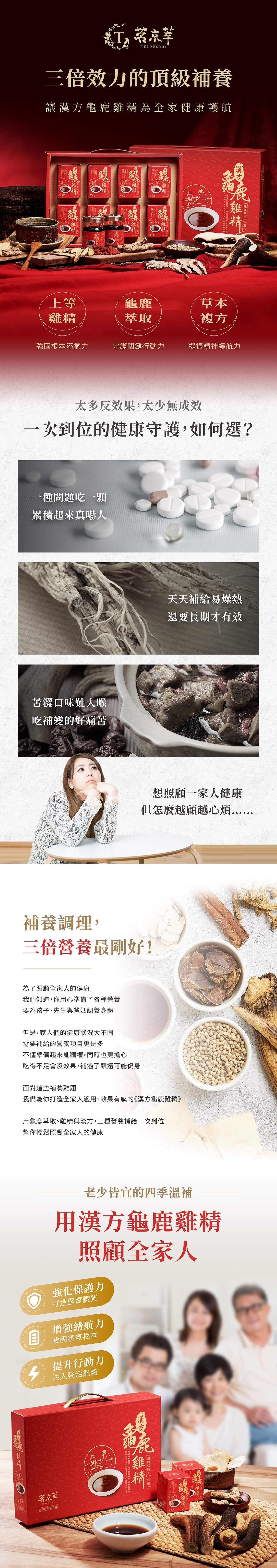 ●以8:2的龜鹿精華,輔以10數種中藥材,融合上等黑羽土雞,歷經8日7夜的熬製,將每日所需的關鍵營養,成就這瓶頂級滋補聖品《漢方龜鹿雞精》。